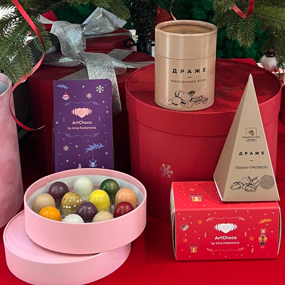 конфеты с выверенными начинками, тягучая нуга, драже с выразительной текстурой, плитка шоколада и аккуратный подарочный бокс.
