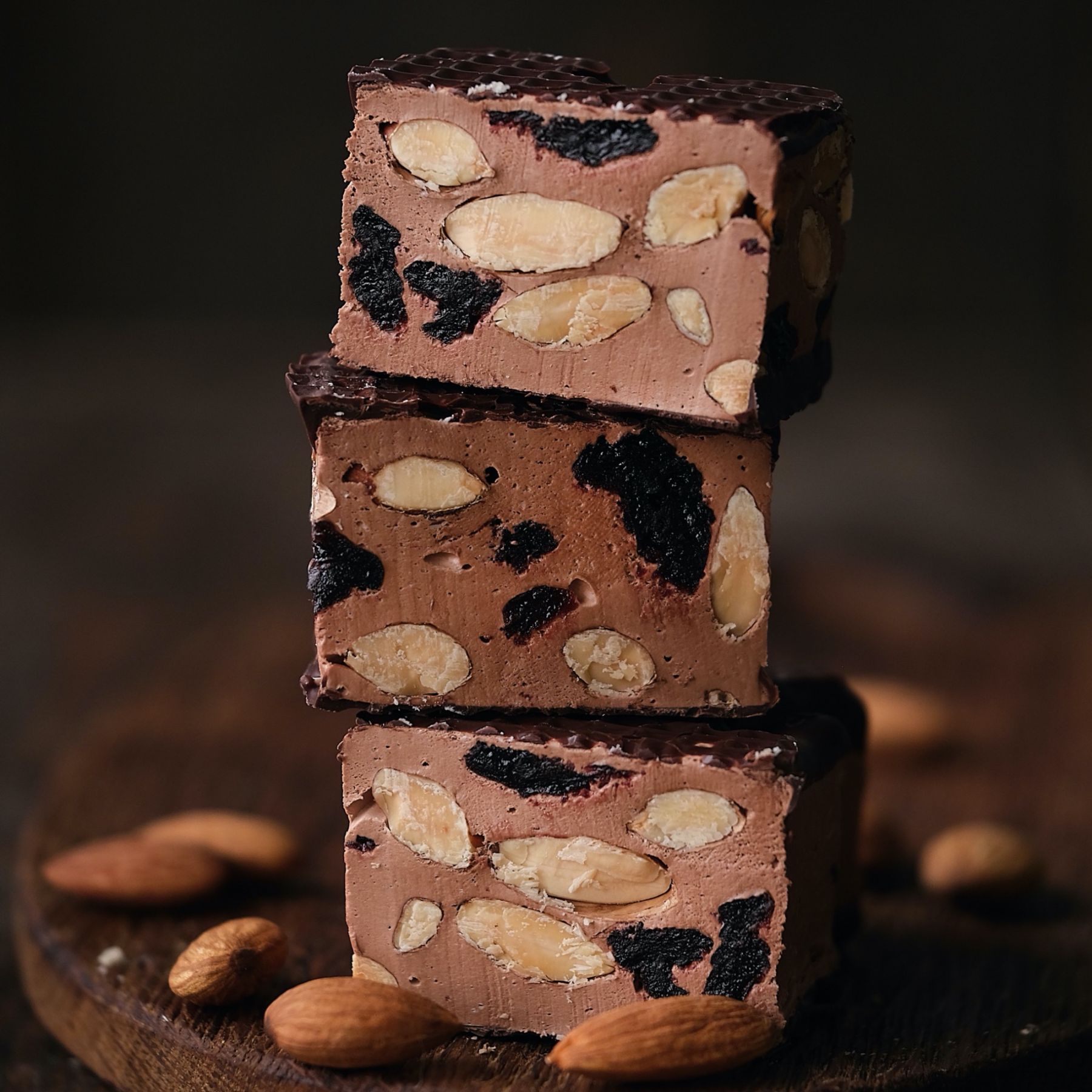 Наша нуга разработана по авторскому рецепту, в ней содержится высокий процент орехов и цукатов (до 50%), так же для придания вкуса и нужной текстуры к базовым ингредиентам мы добавляем шоколад и какао-маcло. Мы используем премиальный швейцарский шоколад Felchlin - лучший профессиональный шоколад на российском рынке. Каждый батончик имеет шоколадное покрытие.