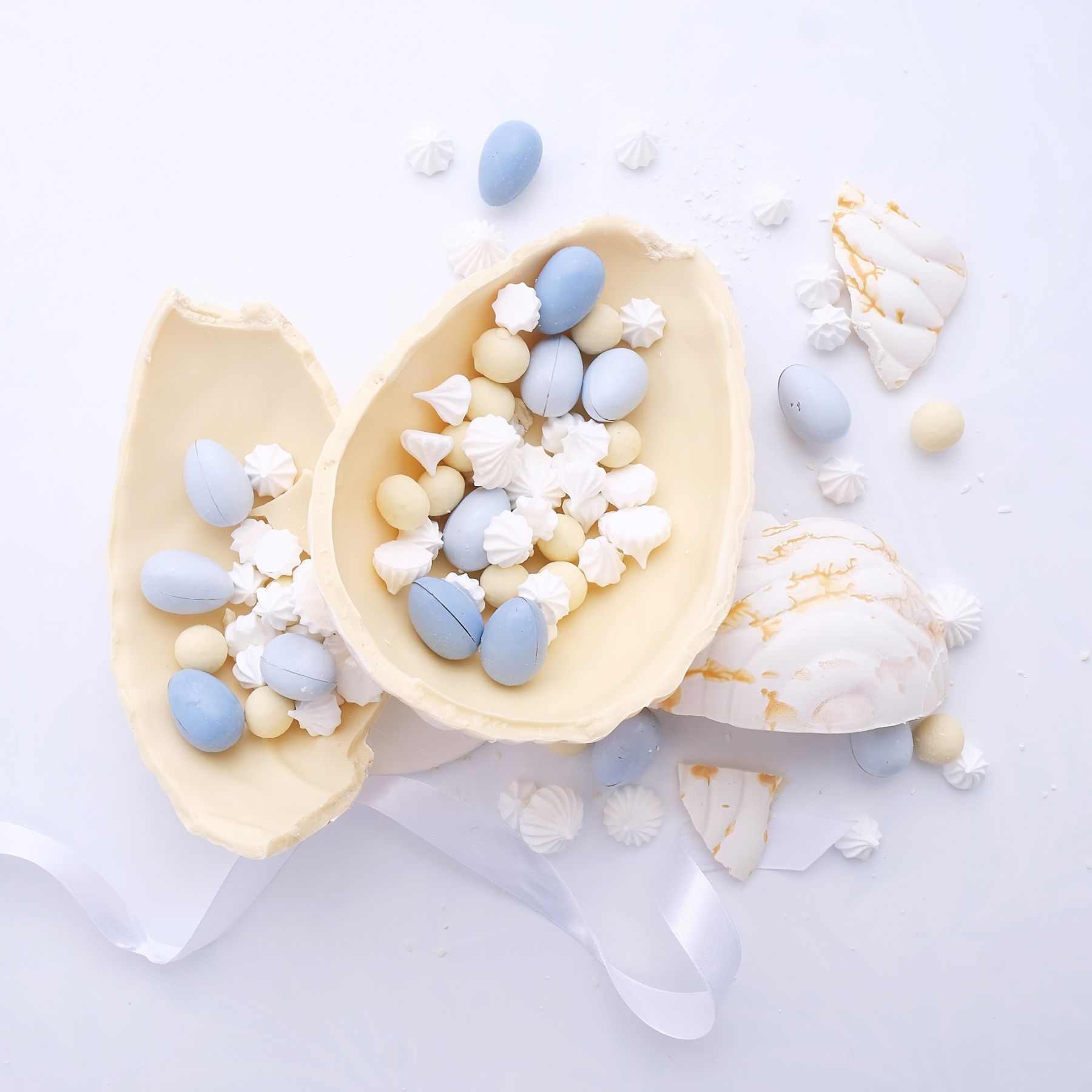 Яйцо выполнено из премиального французского белого или молочного швейцарского шоколада Felchlin.
